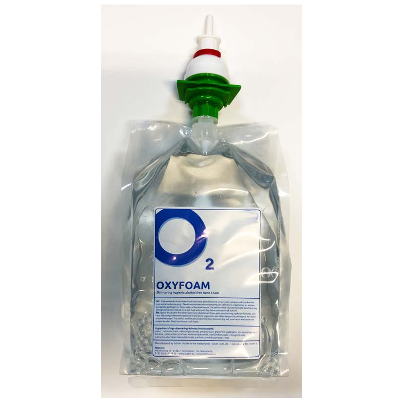 non-alcohol hand sanitaiser / hand rub 1000ml. Oxy Foam handzeep is een huidverzorgend, op zuurstof gebaseerd desinfecterend handschuim voor dagelijkse handhygiëne. Verkrijgbaar in: 1000 ml voor handschuim dispensers. GEEN HANDDOEK NODIG, DROOGT ZELF SNEL OP. Ontsmettingsformule op basis van natuurlijke ingrediënten, verrijkt met actieve zuurstofelementen en een hydraterend effect voor optimale handverzorging en Soft Touch-gevoel.