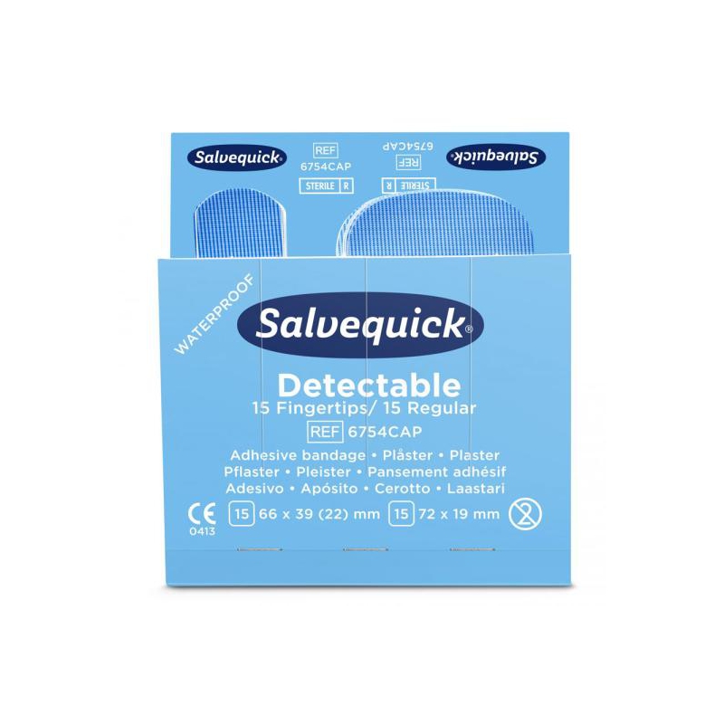De Salvequick Blue detecteerbare pleister wordt door de meeste metaaldetectoren, die in de levensmiddelenindustrie gebruikt worden, herkent. Door de blauwe kleur kan de pleister gemakkelijk visueel worden ontdekt. Voor de hygiëne bij de hantering van levensmiddelen is het absorberende wondkussentje een stuk van de rand van de pleister aangebracht, zodat de pleister goed rond de wond sluit. De pleister is extra zacht en volgzaam. Elke pleister is steriel verpakt.